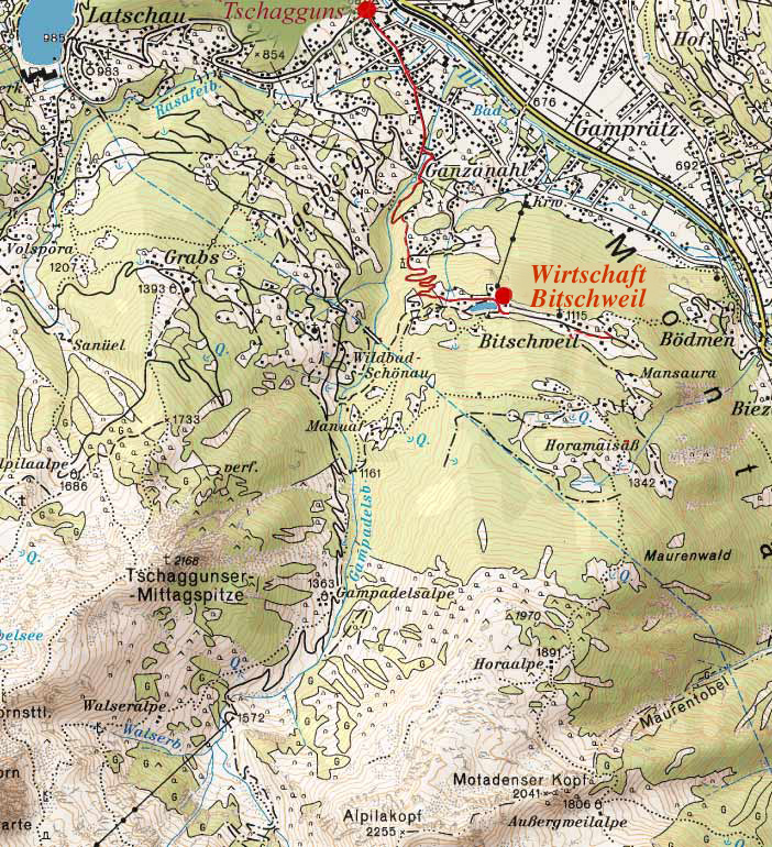 Von der Landbushaltestelle Tschagguns-Bödmen, auf schönem Fußweg über Bödmen zur Wirtschaft Bitschweil. Der Abstieg führt auf der gut ausgebauten Fahrstraße zurück nach Tschagguns-Ortsmitte.