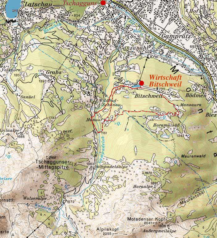 Ausgangspunkt ist die Wirtschaft Bitschweil, vorbei an der Kapelle Bitschweil, dann rechts hoch über den Güterweg bis Horamaisäß, rechts ab in Richtung Manuaf und Gampadelstal, zurück nach Bitschweil entweder über den Höhenweg, der vor der "Sagabrogg" nach rechts abzweigt oder über die "Sagabrogg" zum Tilisunaweg, diesen entlang bis zur Kreuzung mit dem "Aquaweg", der ebenfalls nach Bitschweil führt.