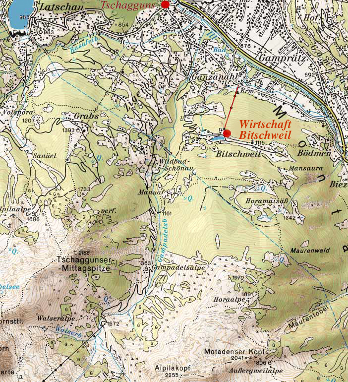 Kurz unter dem Stausee lädt die Wirtschaft Bitschweil zu einer wohlverdienten Rast ein. Der Abstieg führt auf der gut ausgebauten Fahrstraße zurück zum Ausgangspunkt nach Tschagguns.