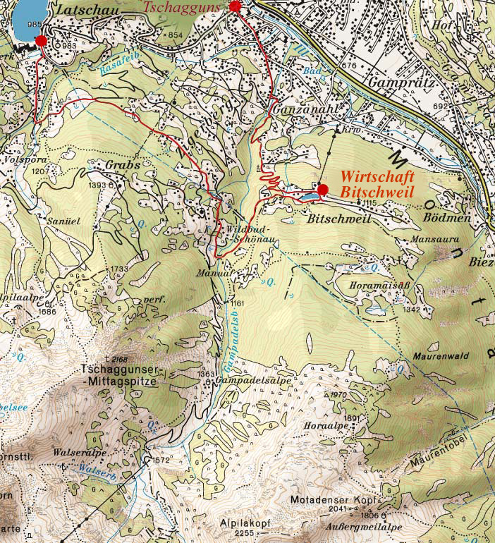 Der Aquaweg führt zuerst mit dem Postautobus vom Gemeindeamt Tschagguns nach Latschau (Haltestelle Kraftwerk) in ca. 1000 m Höhe. Von dort geht es Richtung Gauertal, nach einigen hundert Metern zweigt der Weg links ab. Er ist gut beschildert (Bitschweil, Wirtschaft Bitschweil). Da keine großen Steigungen vorhanden sind ist der Weg ideal geeignet für Familien, Gruppen und Senioren. Nach Überquerung des Rasafeibaches kommt man zum Ziegerberg, dann über den Gampadelsbach zum Staubecken Bitschweil.